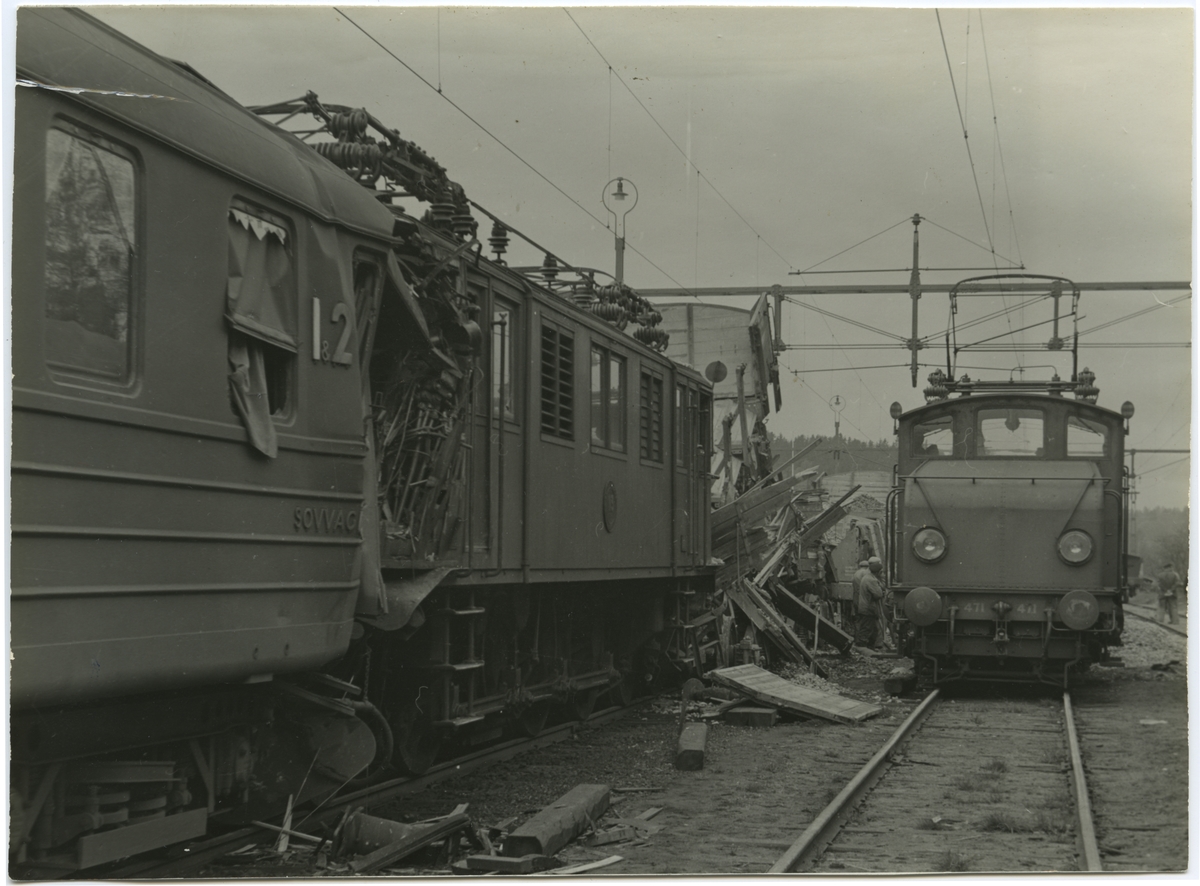 Tågolycka. Till höger i bild hjälplok Statens Järnvägar, SJ Ha 471.