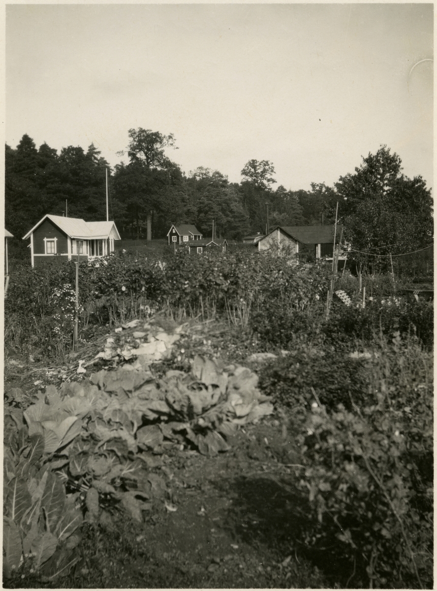 Titel: Tomteboda koloniområde. Gruppering av kolonistugor vid skogsbrynet.