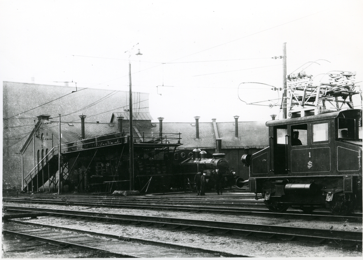 Stockholm Norra lokstall med Statens Järnvägar, SJ ellok 1 "Westinghouse" och ett ånglok SJ Ke..
