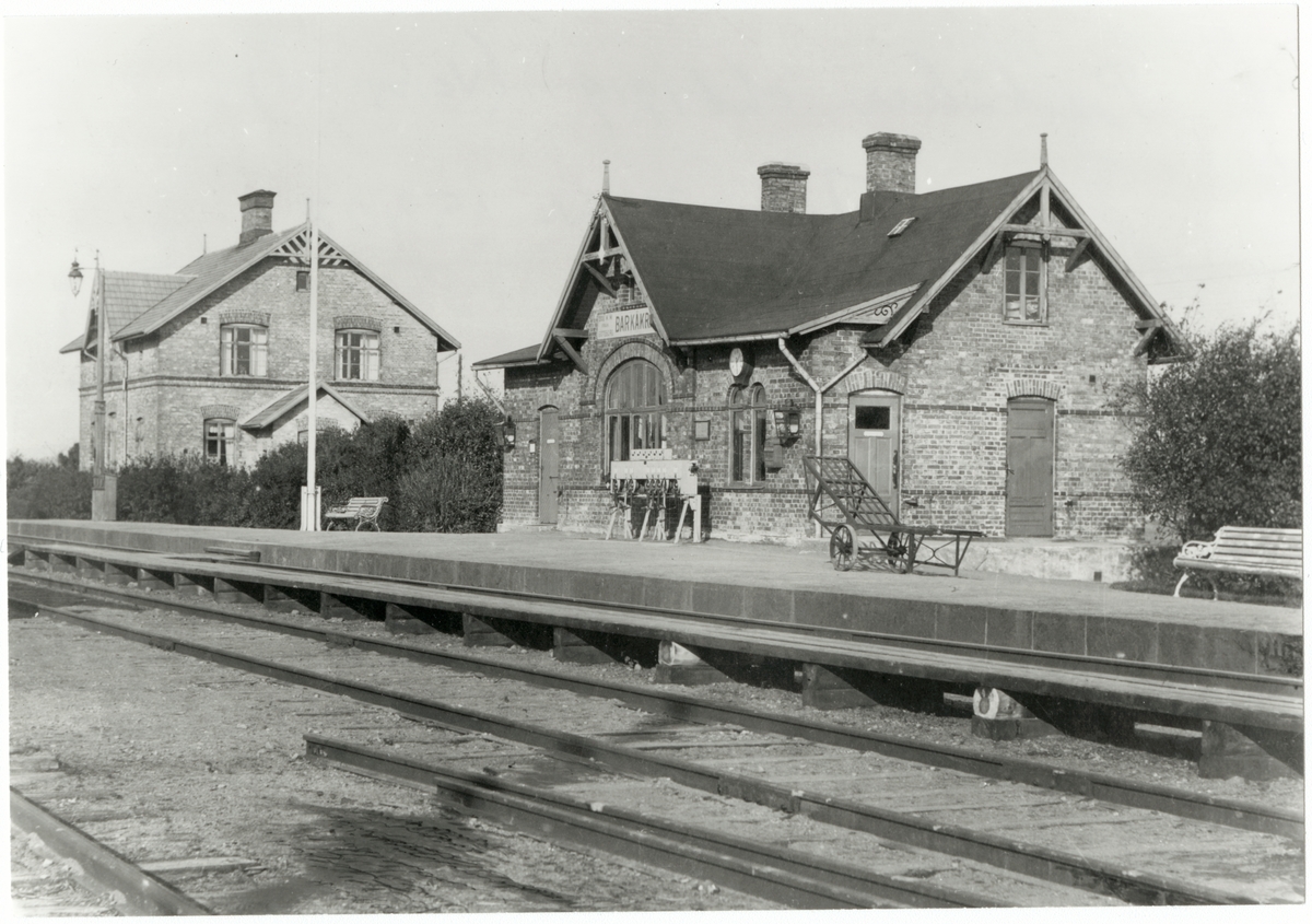 Skåne - Hallands Järnväg, SHJ. En gaslykta ses på plattformen tillsammans med en kärra i järn.