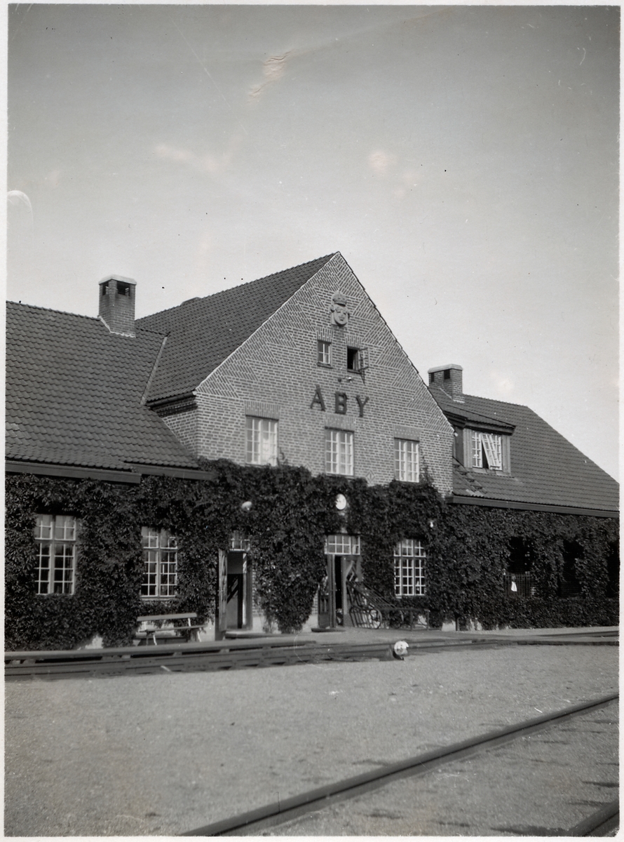 Titel: Åby stationshus med vildvin växande på väggen.