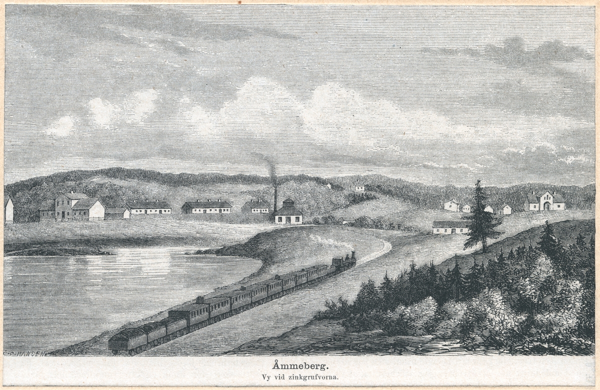 Träsnitt, vy över zinkgruvorna i Åmmeberg, 1871.