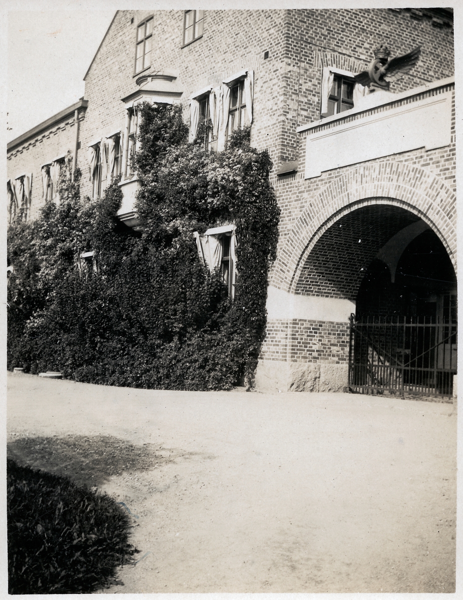 Titel: Örebro centralverkstad med SJ logga ovanför entrén till kontorslokalen.
