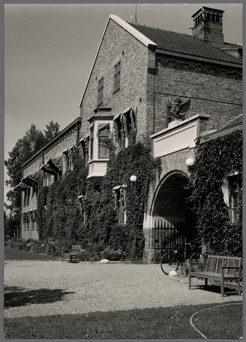 Titel: Örebro centralverkstad med SJ logga ovanför entrén till kontorslokalen.