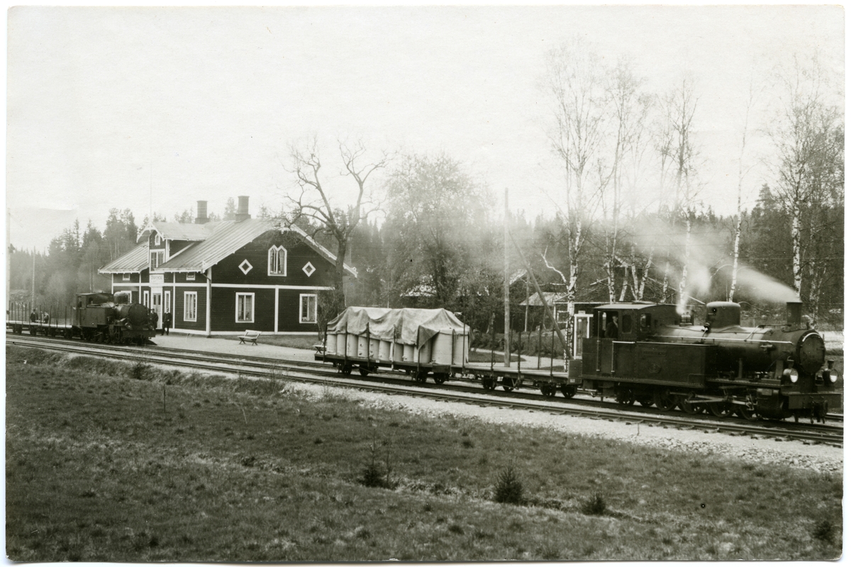 Titel: Sävsnäs Järnvägs SVJ lok 6 "Hans Oson Ström" vid Gravendal station. I bakgrunden SVJ lok 7 "Knut Falk".