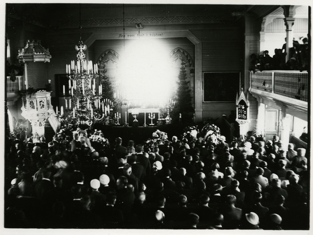 Begravningsceremoni, i Arvidsjaur kyrka, för olycksoffren från tågolyckan i Moskosel som inträffade den 27 juni 1935.