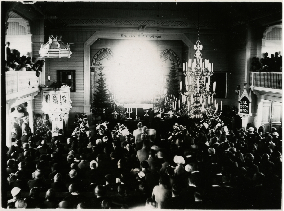 Begravningsceremoni, i Arvidsjaur kyrka, för olycksoffren från tågolyckan i Moskosel som inträffade den 27 juni 1935.