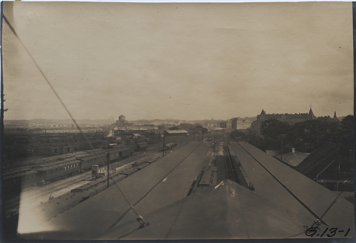Titel: Banhallens tak och vy över bangården vid Göteborgs station.