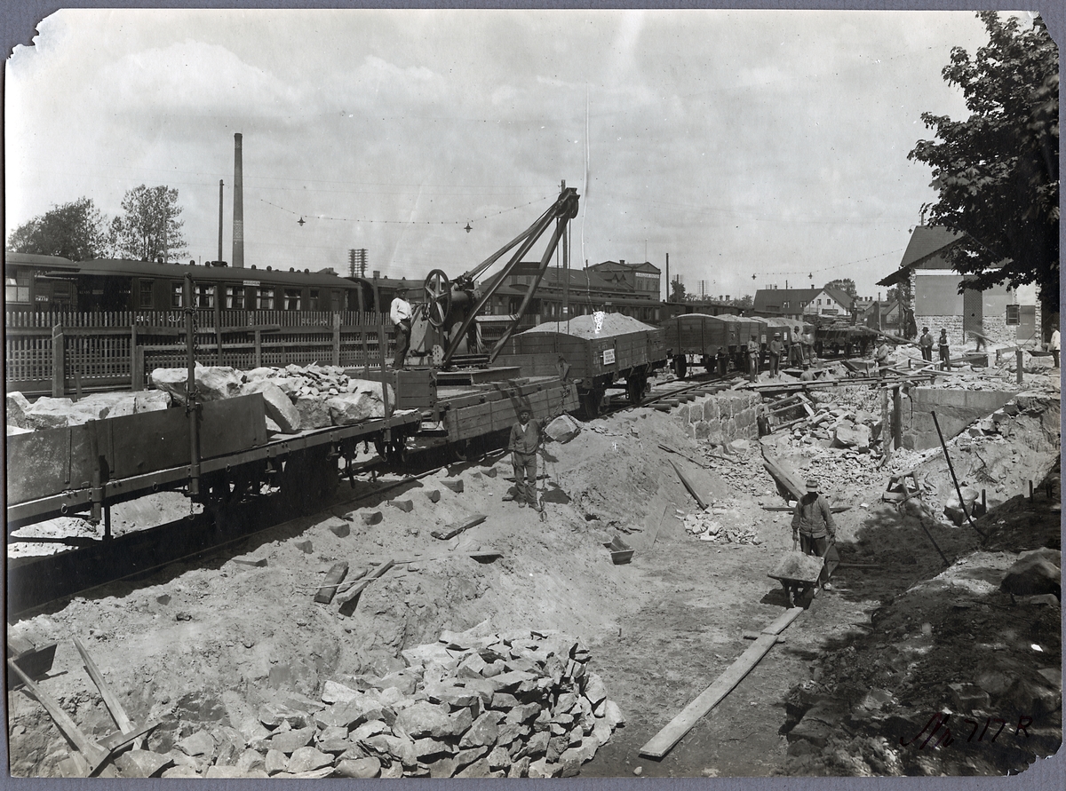 Uppförande av nya stationshuset. Statens Järnvägar, SJ godsvagn 4571. Hässleholm Markaryds Järnväg, HMJ personvagn 40.