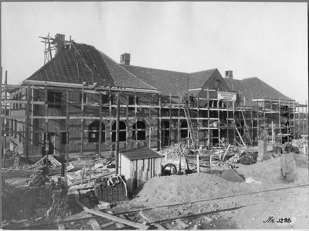 Titel: Höganäs stationshus under uppbyggnad.