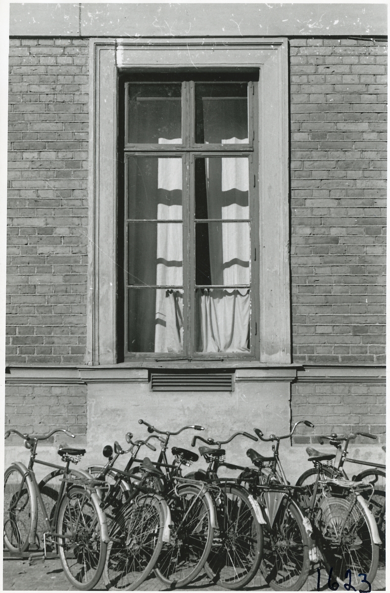 Titel: Cyklar parkerade vid stationshuset.