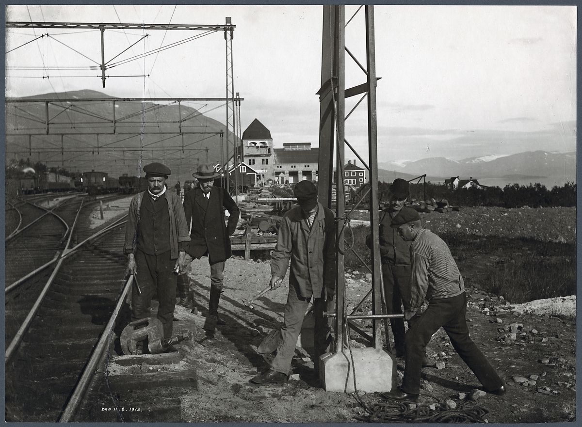 Titel: Arbete med kontaktledningsstolpe vid Abisko östra station.