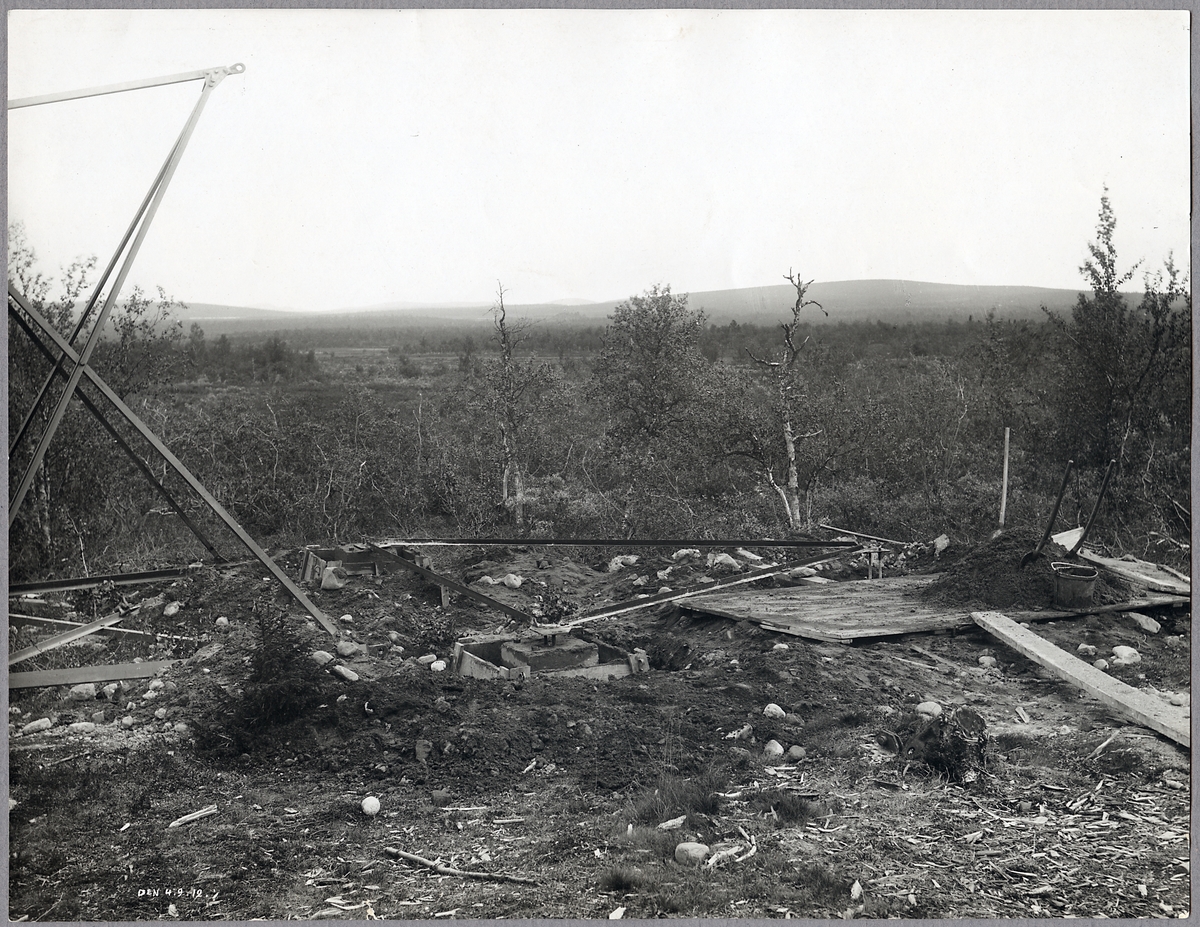 Titel: Kraftledningsstolpe ligger i väntan på att uppföras.