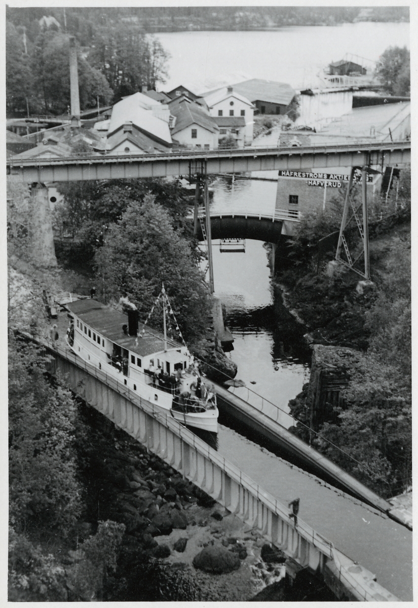 Titel: Under järnvägsbron passerar ångaren akvedukten i Håverud.