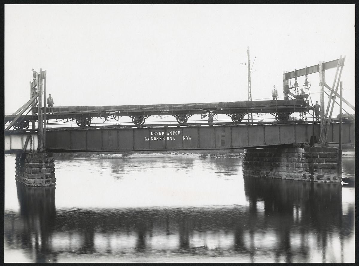 Utbyte av brospann på järnvägsbron över Klarälvens östra gren i Karlstad. Statens Järnvägar, SJ 20765, 20865 Godsvagn öppen.