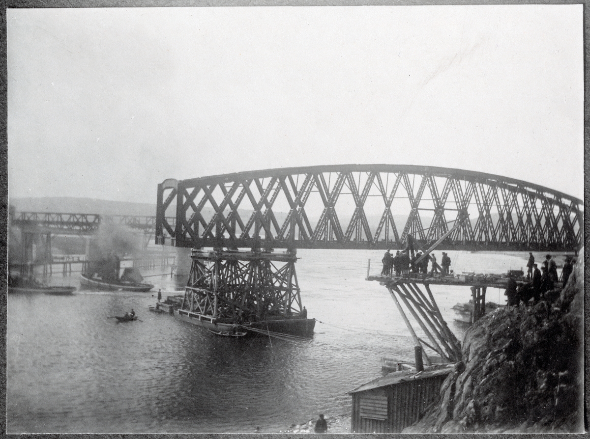 Titel: Järnvägsbron flyttas med båtar till brofäste.