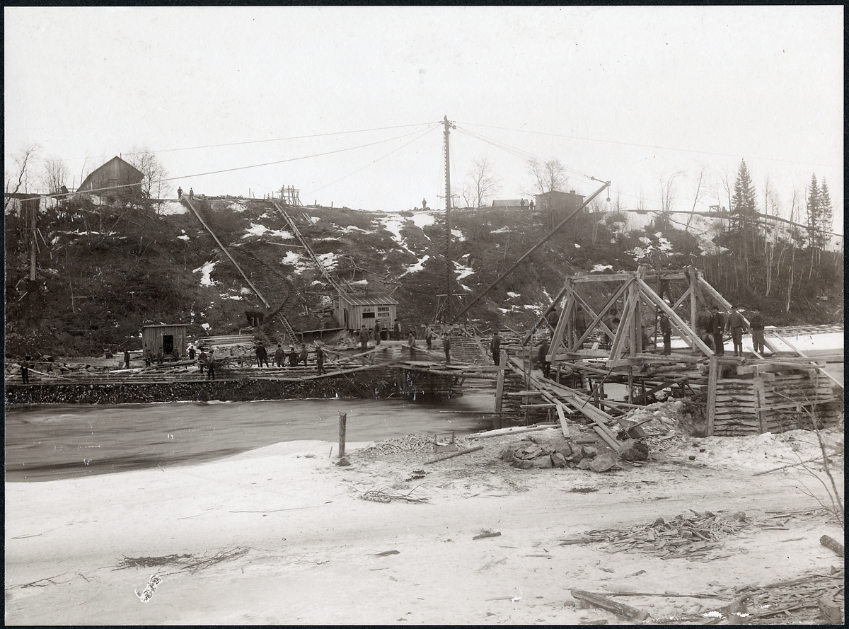 Järnvägsbron över Skellefteälven på linjen mellan Klutmark och Slind under byggnation, då statsbanan Bastuträsk-Skellefteå-Skelleftehamn byggdes.