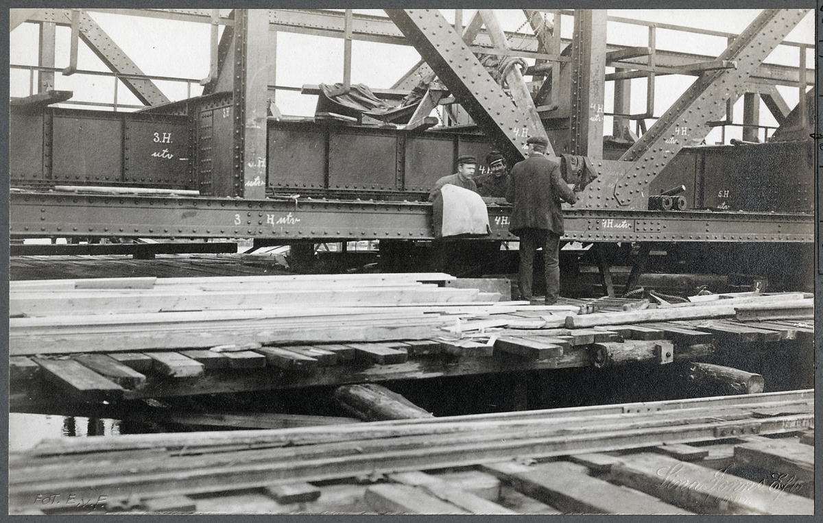 Järnvägsbron över Stångån vid Linköping. Detalj av överbyggnaden under montering.