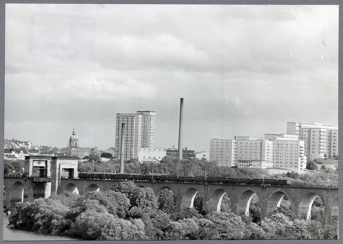 Årstabron från norr, med Katarina kyrka och Södersjukhuset i bakgrunden.