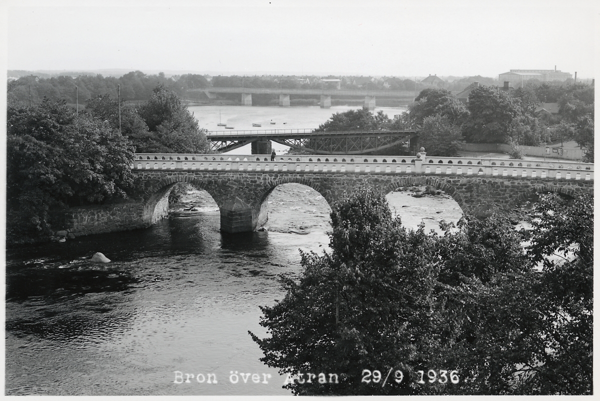 Tre broar över Ätran i Falkenberg. Närmast i bild Tullbron, stenvalvsbro från 1761, därefter den gamla järnvägsbron 1886-1937 och längst bort i bild den nya järnvägsbron 1936-2009.