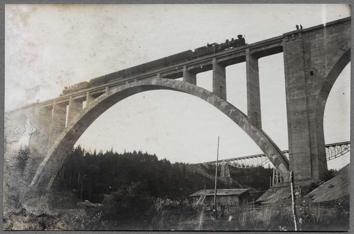 Titel: Provbelastning på den andra bron över Öreälven 1919. Den första äldre bron i bakgrunden.