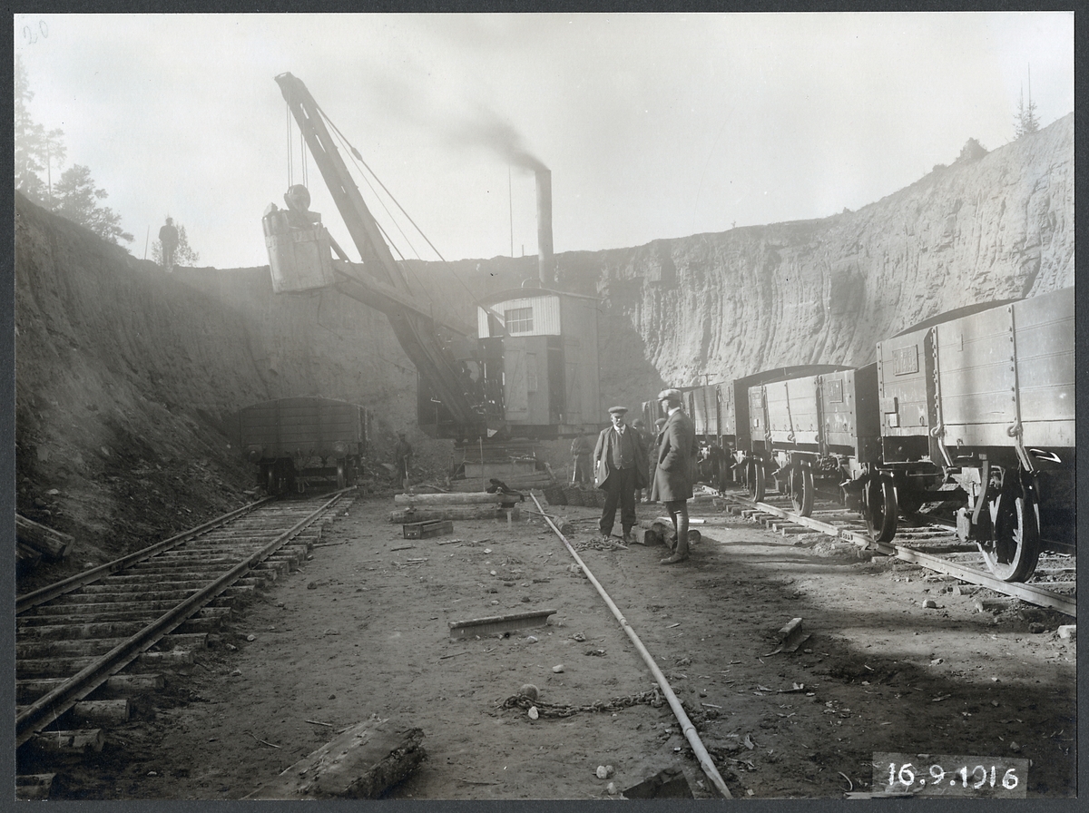 Grävmaskinsarbete under byggnaden av Tallbergsbron. Statens Järnvägar, SJ godsvagn 14145.