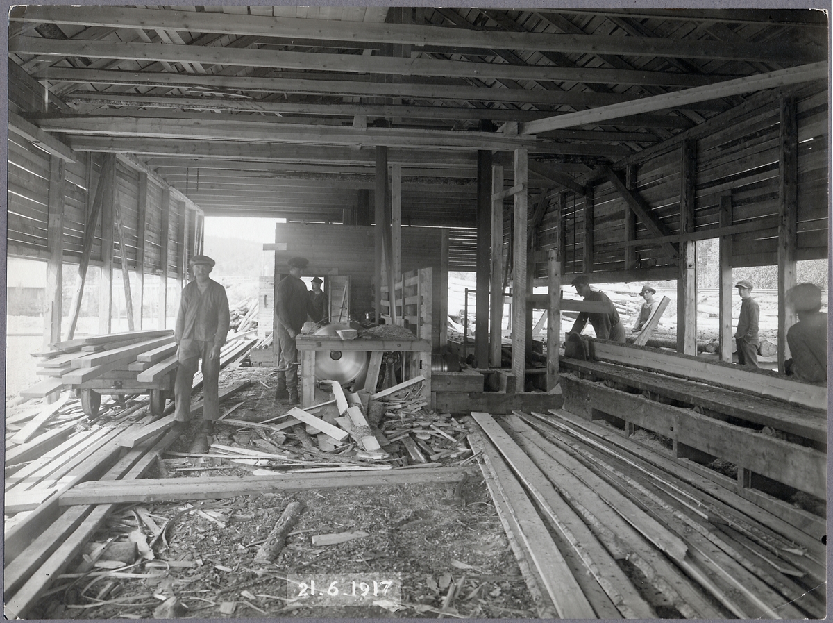Titel: Interör från sågen vid brobygget över Öreälven.
