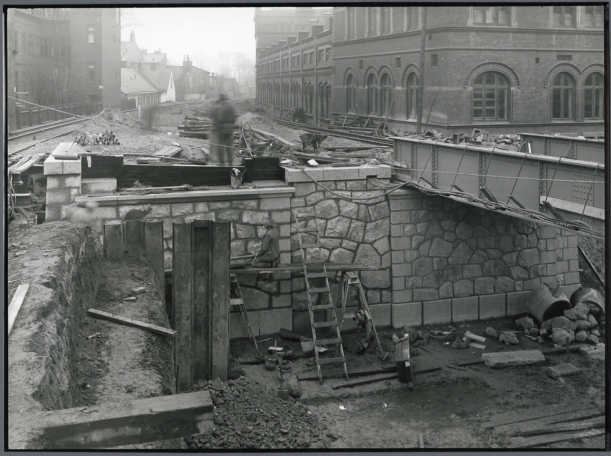 Byggnation av vägport över Trollebergsvägen i Lund. Plintarna på plats för södra landfästet för nedspåret.