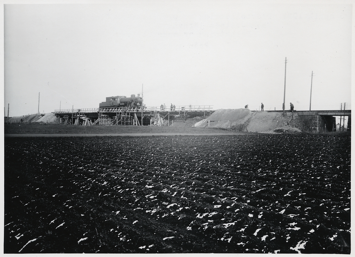 Ombyggnad av viadukten över Malmö Ystads Järnväg, på sträckan mellan Malmö och Trelleborg. Provbelastning av provisorisk viadukt.
