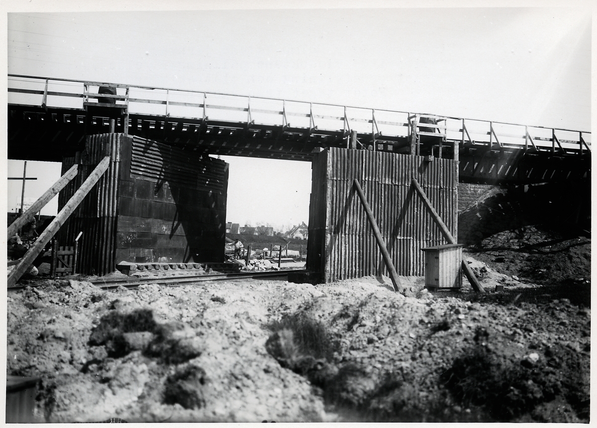 Ombyggnad av viadukten över Malmö Ystads Järnväg, på sträckan mellan Malmö och Trelleborg. Provisoriska viaduktens pallningar.