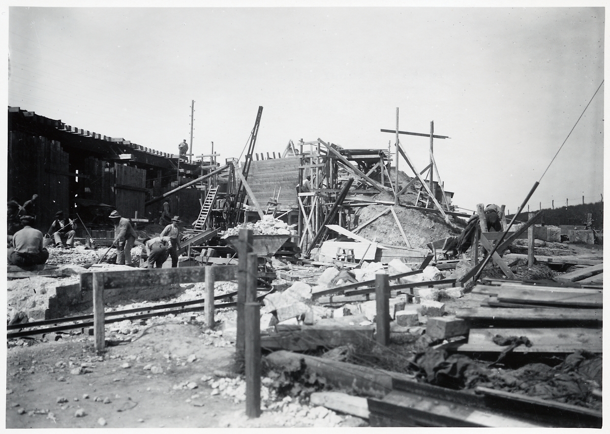 Ombyggnad av viadukten över Malmö Ystads Järnväg, på sträckan mellan Malmö och Trelleborg. Gamla norra landfästet nästan borttaget. Nya norra landfästet under gjutning.