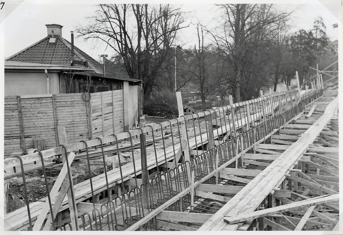 Uppförande av stödmur för järnvägsbanken vid byggnationen av ny järnvägsviadukt över Norrtullsgatan. Belägen ca 100 m öster om östra landfästet i nya vidaukten.