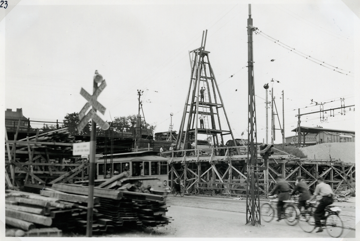 Titel: Byggnationen av ny järnvägsviadukt över Norrtullsgatan. Pålning för västra landfästet i norra brodelen.
