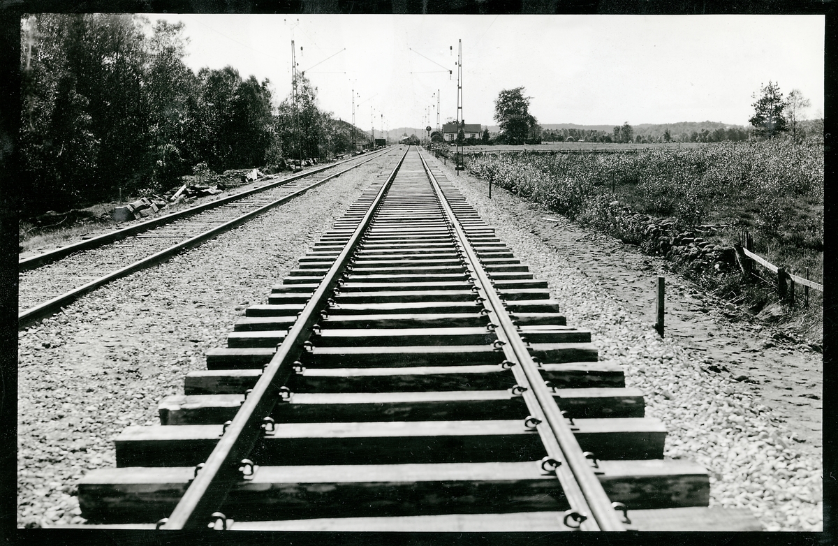 Titel: Utlagd räls utan makadam på provsträckan mellan Sösdala och Tjörnarp.