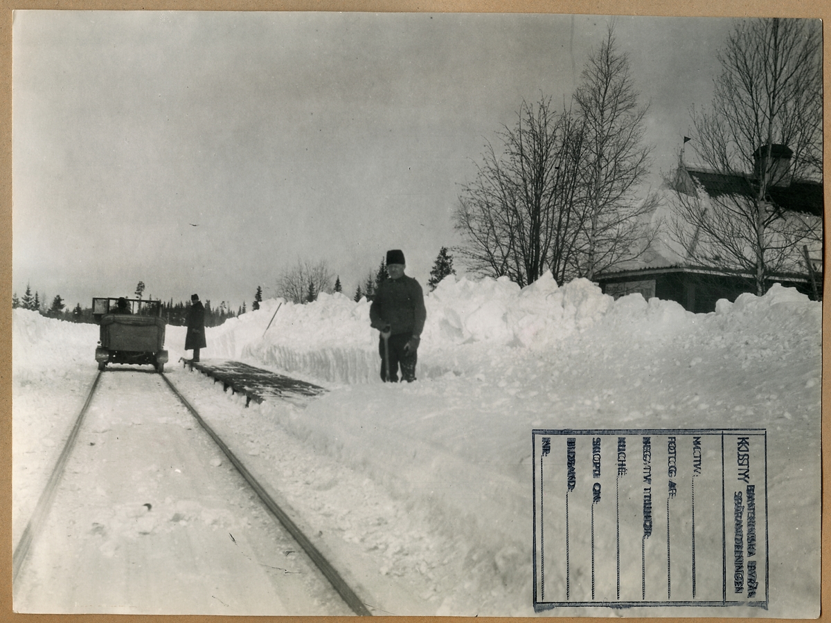 Snöskottning av plattform vid Gråtbäck Station. Längre bort en motordressin, så kallad "bil-dressin".
