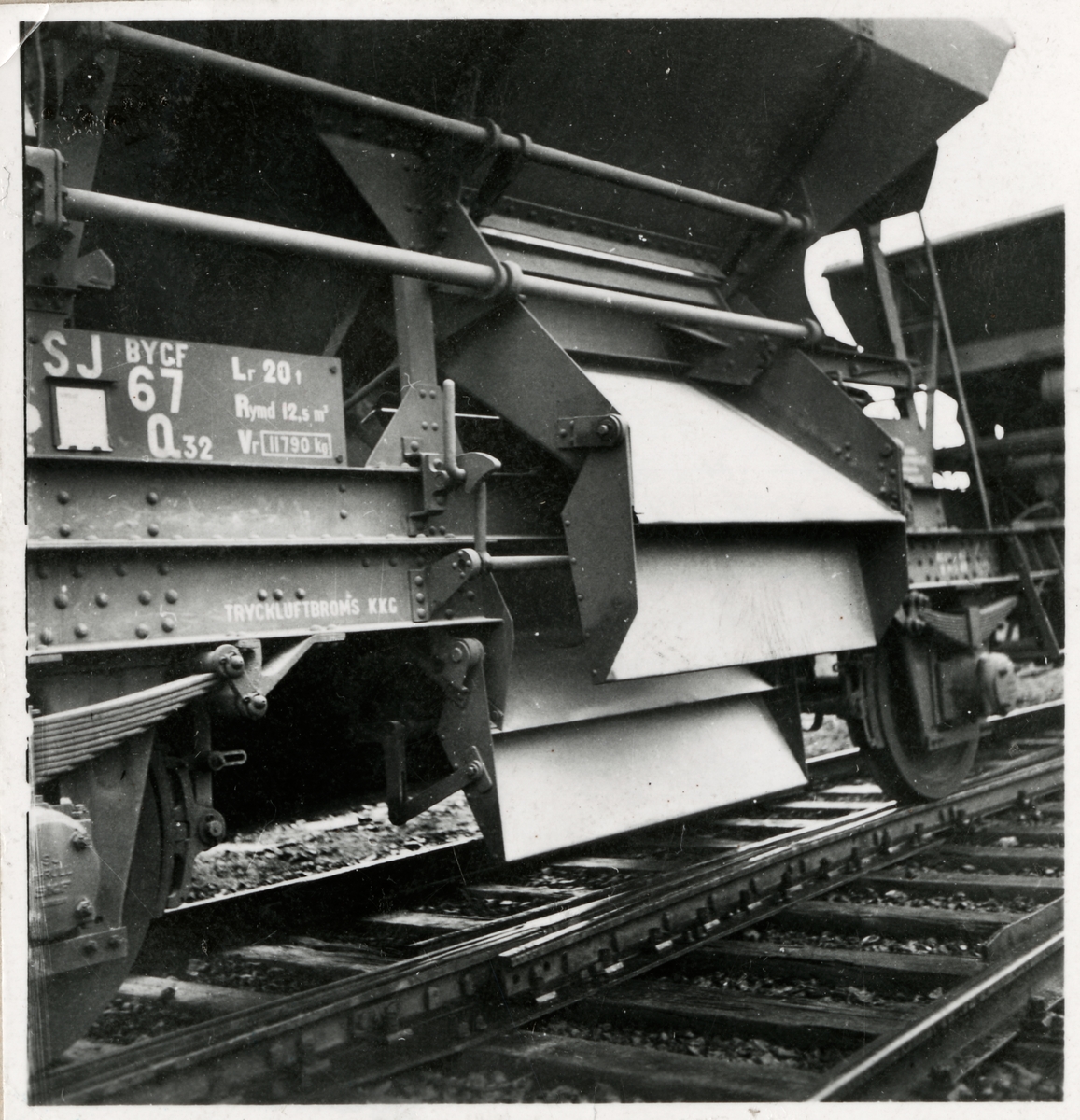 Statens Järnvägar, SJ Q32 67 Bottentömningsvagn, typ: "Talbot", tillhör avdelning BYCF (byggnadscentralförrådet), längd 6,7 och hjulbas 4,5.