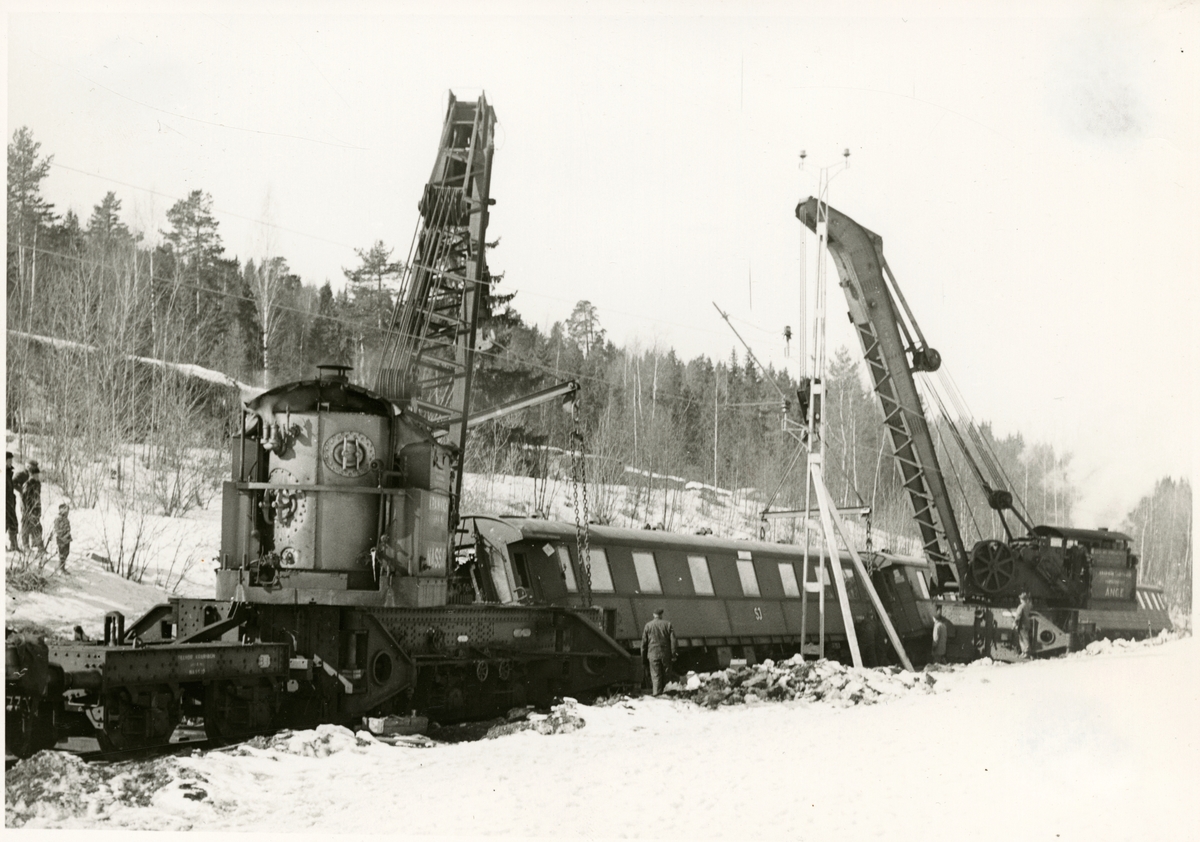 Titel: Tåg 93, Nordpilen, efter urspårning på sträckan mellan Simeå och Undersvik 1956-03-27.