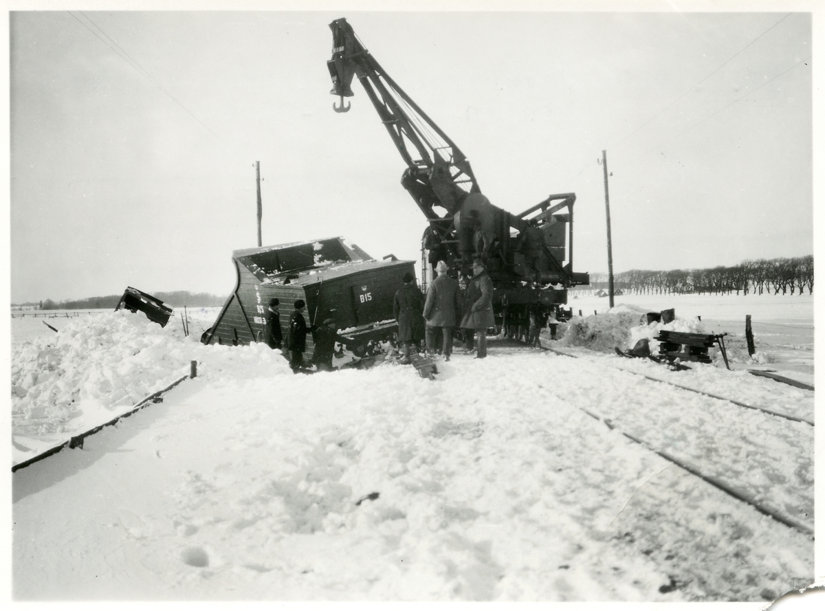Bild från linjen mellan Viderup & Gårdstånga. Bärgning av Statens Järnvägar, SJ snöplog B15.