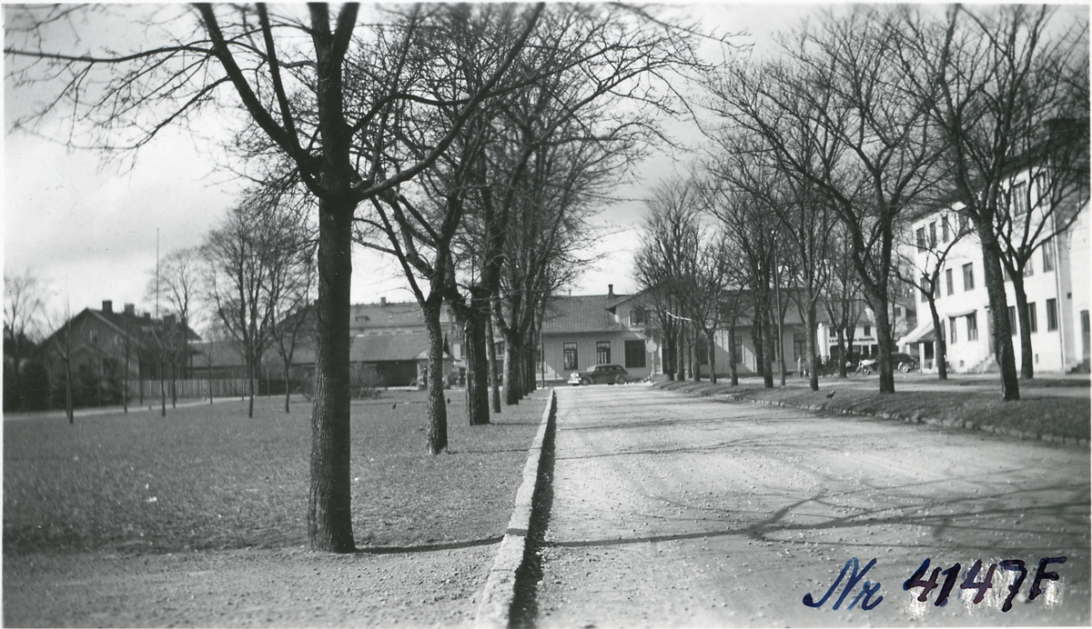 Titel: Esplanadgatan i Osby med stationshuset i bakgrunden.