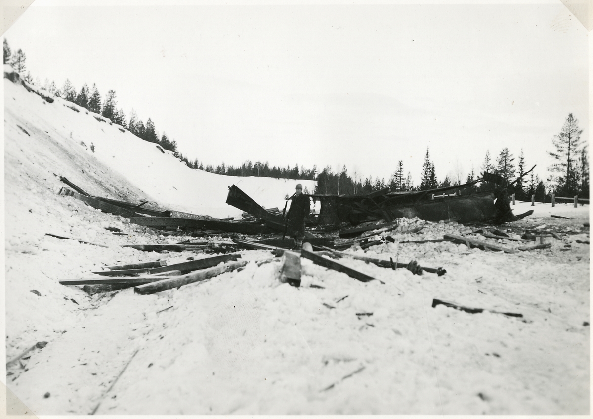 Titel: Bombning av plåtbalksbro i Ålså. Efter tre bomber.