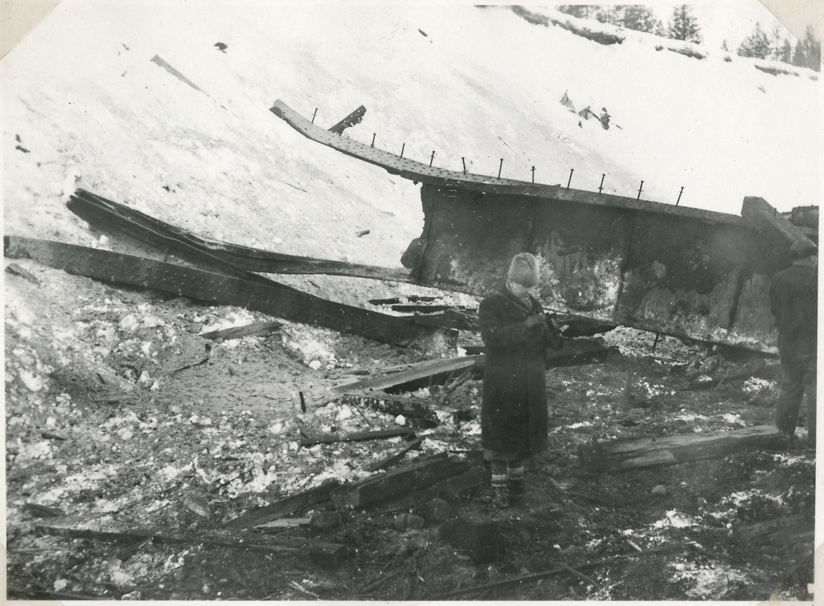 Titel: Bombning av plåtbalksbro i Ålså. Efter 250 kg:s bomb.