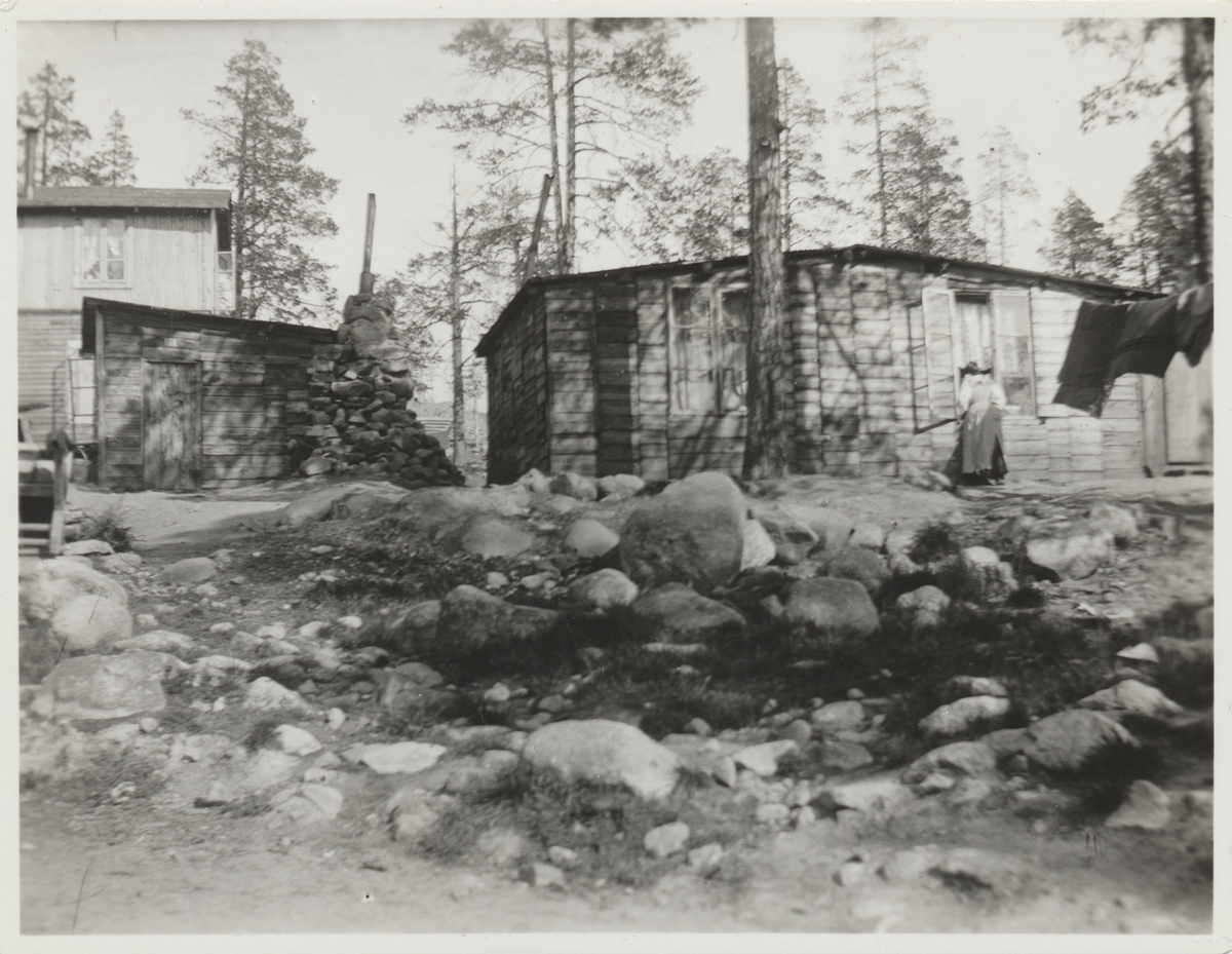 Titel: Boningshus byggda av tomlådor i "Kåkstaden"i Malmberget