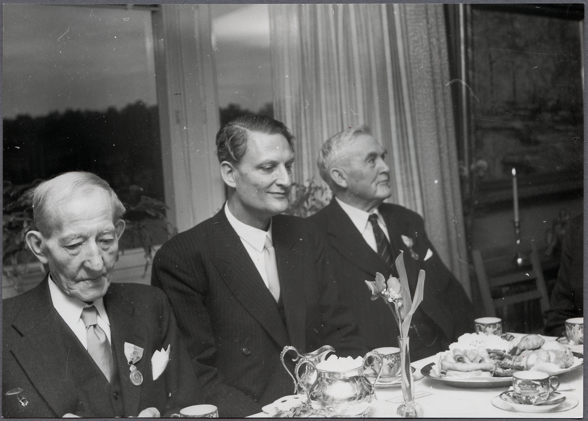 Statens Järnvägar, SJ:s General direktör Erik Upmark förrättar medaljutdelning till Stockholm-Roslagens Järnvägar, SRJ:s personal i Vd Åke Nerells hem i Stocksund.