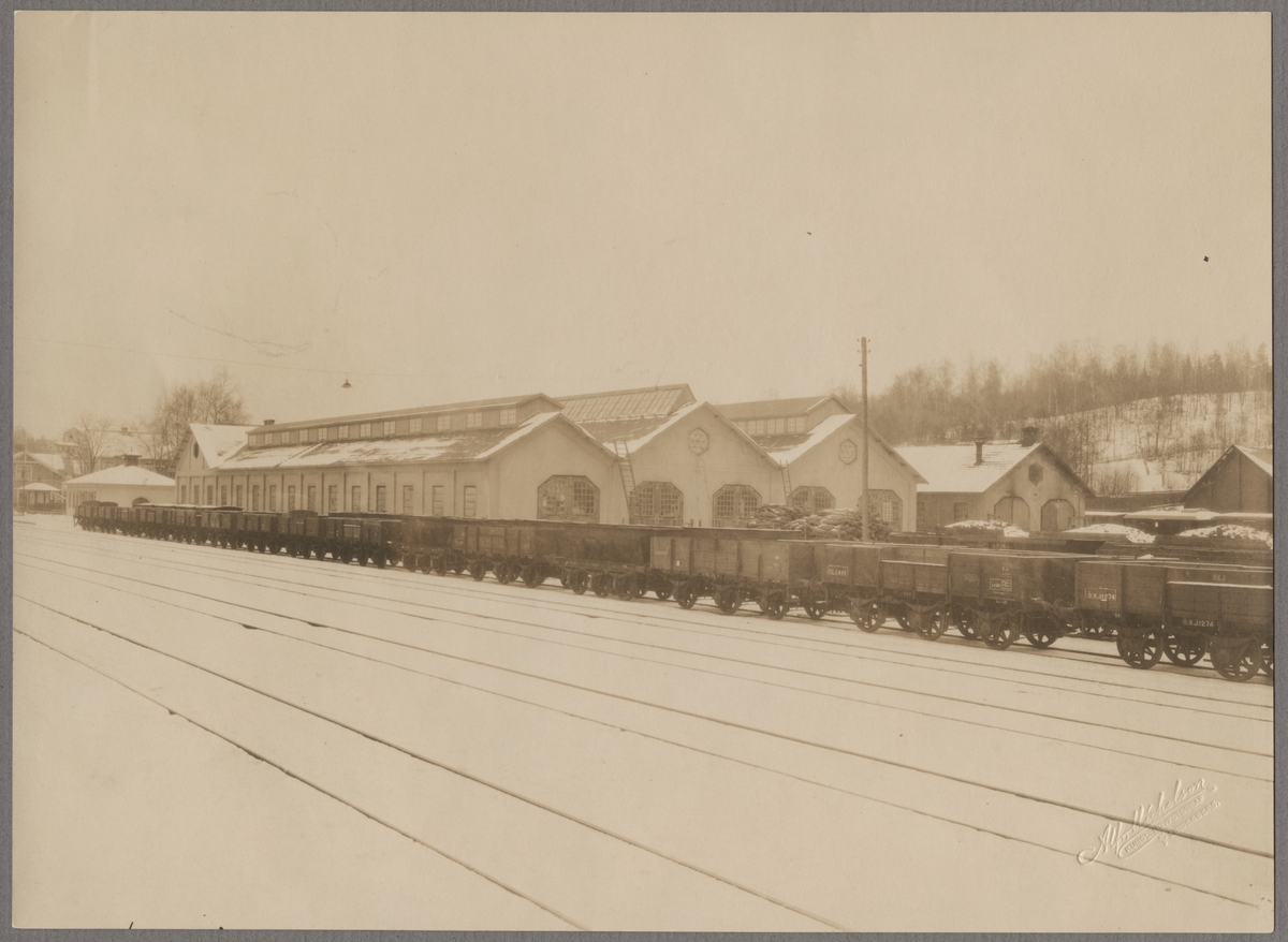 Verkstaden i Kopparberg. På bangården står malmvagnar uppradade, där ibland Frövi - Ludvika Järnväg, FLJ M3 840 och Örebro - Köpings Järnväg, ÖKJ M3 1274.