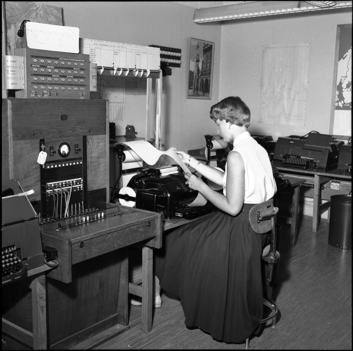Kvinna i arbete med telexanläggning på Centralstation i Stockholm.