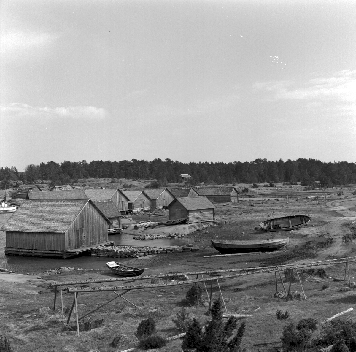Ålandsresa. Skärgård. Fiskeläger med ekor och fiskebåt