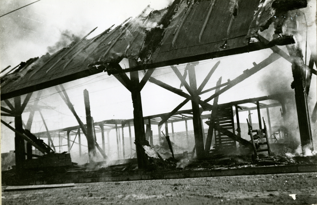 Plattform och vagnar efter explosionen av ett tyskt ammunitionståg på Avesta Krylbo station. Krylbosmällen.