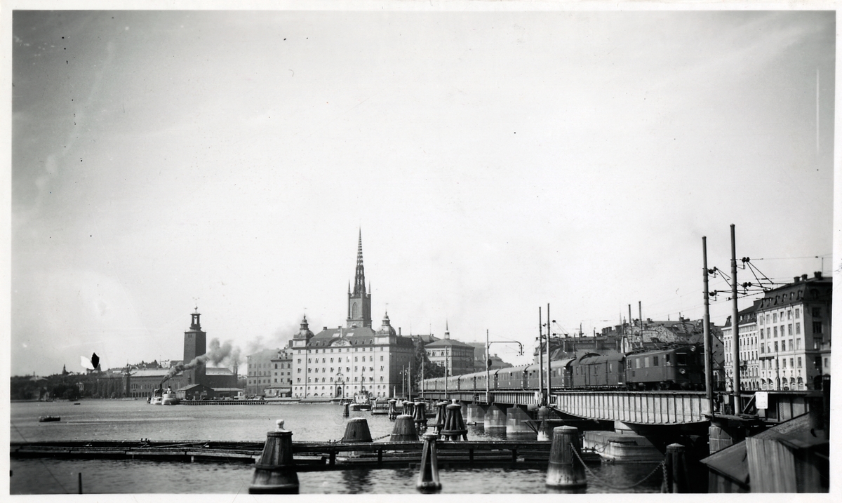 Tåg 97 passerar över södra järnvägsbron på sträckan mellan Riddarholmen och Mälarstrand 1938.
