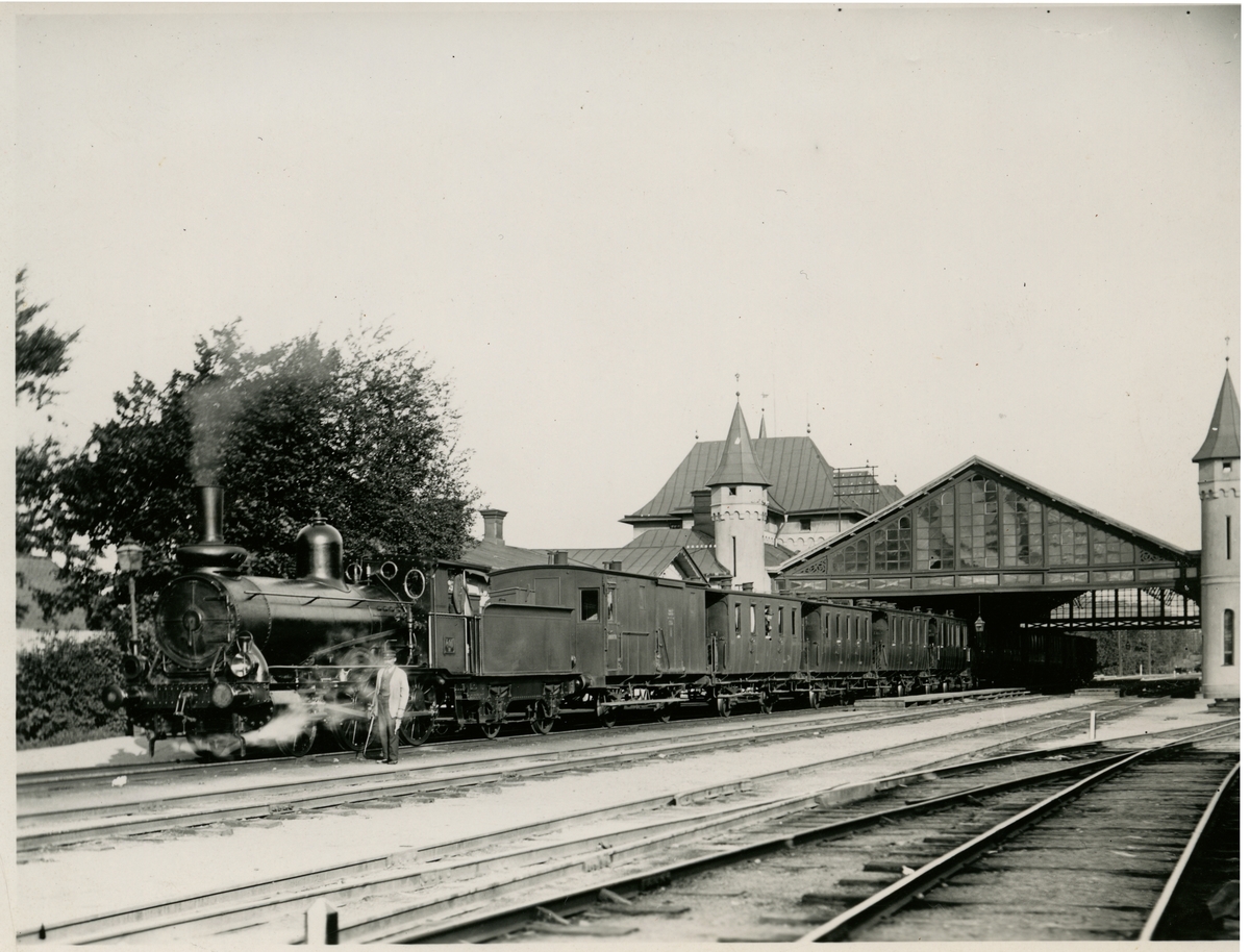 Uppsala Central år 1895 . Persontåg mot Stockholm framfört av SJ Lok Db 401 Tillverkat Motala verkstad 1891. Identifierade vagnar efter loket: F3a 1754, C2, C2, C1, BC1.