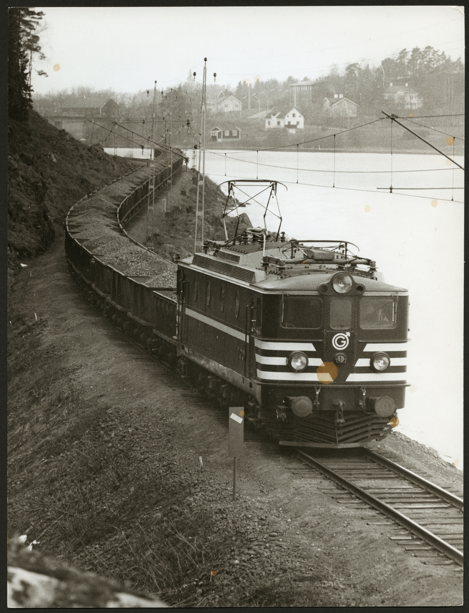 Trafikaktiebolaget Grängesberg - Oxelösunds Järnvägar, TGOJ malmtåg på linjen mellan Grängesberg och Oxelösund april 1967.
